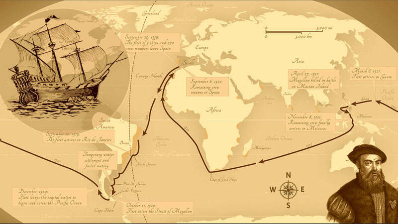 In september 1519 verliet Fernão de Magalhães (zijn Portugese naam) de haven van Sevilla in Spanje. Hij wilde een nieuwe zeeroute naar het Verre Oosten vinden. Daarvoor voer hij met zijn 5 schepen en 237 bemanningsleden richting het westen.